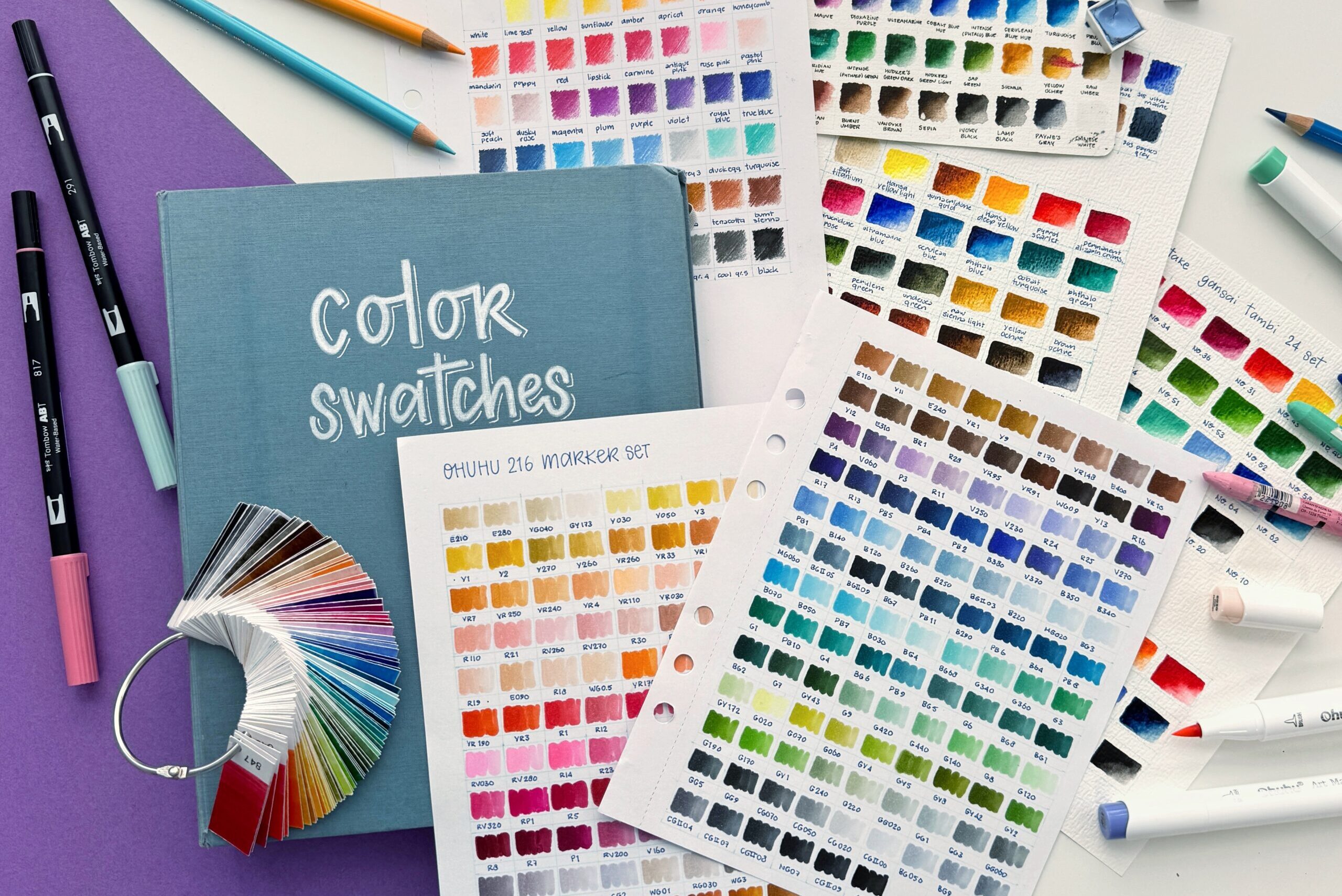 Voor deze cursus hoef je he-le-maal niks nieuws te kopen: we gaan juist swatchen wat je al in huis hebt! Of het nou potloden, pastelkrijtjes, alcoholmarkers, gouache, aquarel, acrylmarkers of brushpennen zijn. Alles waarvan jij meerdere kleurtjes in huis hebt, kun je swatchen! Ik laat in de cursus diverse voorbeelden zien met verschillende materialen, zodat de cursus voor elk materiaal interessant is. Ook geef ik tips over papier en schetsboeken die je hiervan kan gebruiken.