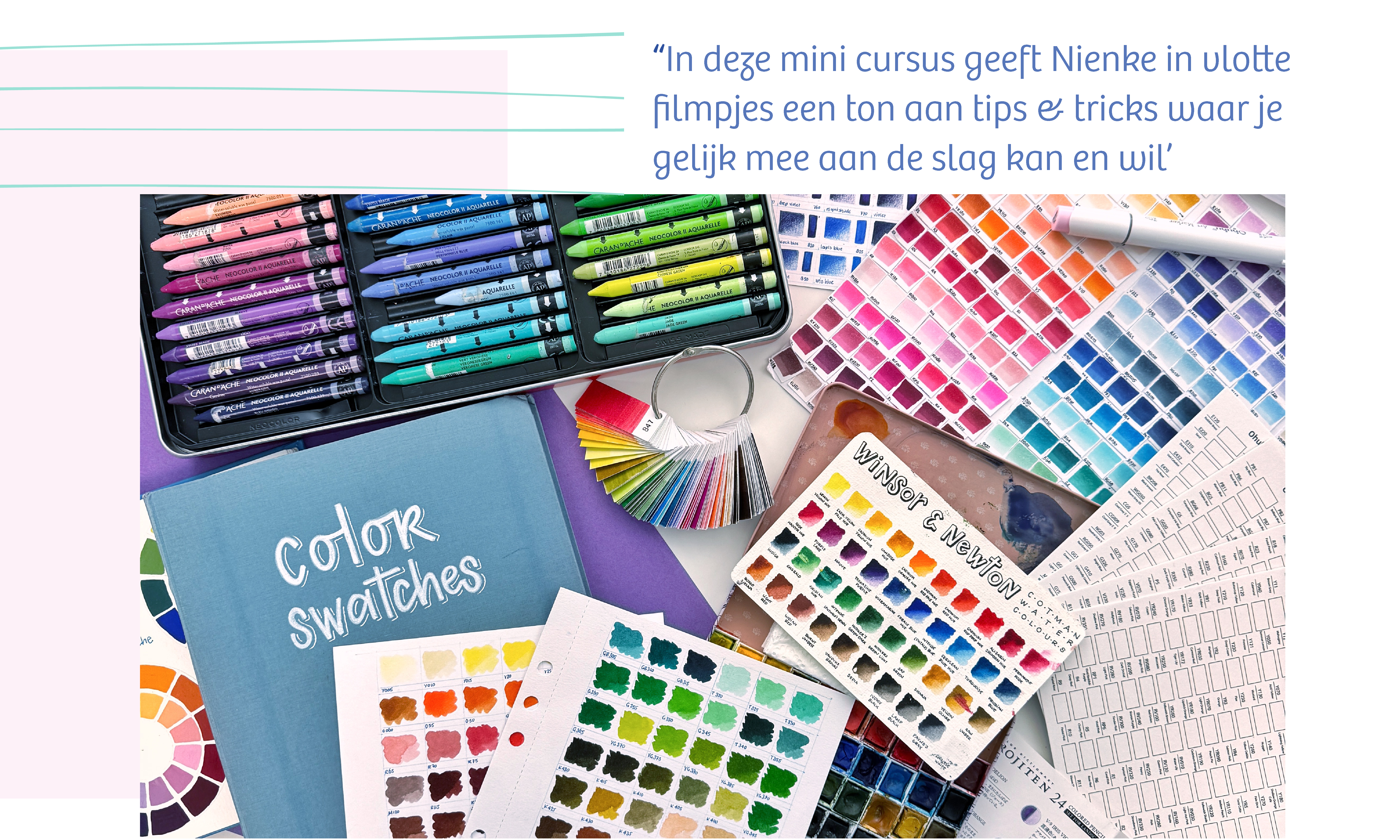 In deze mini-cursus leer je stap voor stap hoe je het swatchen van kleuren aanpakt! Of je nu georganiseerd aan de slag wilt of gewoon zin hebt in een zen-momentje kleuren. In deze heerlijk cursus Kleuren Swatchen zit alles wat je nodig hebt, inclusief een E-book vol templates en voorbeelden!