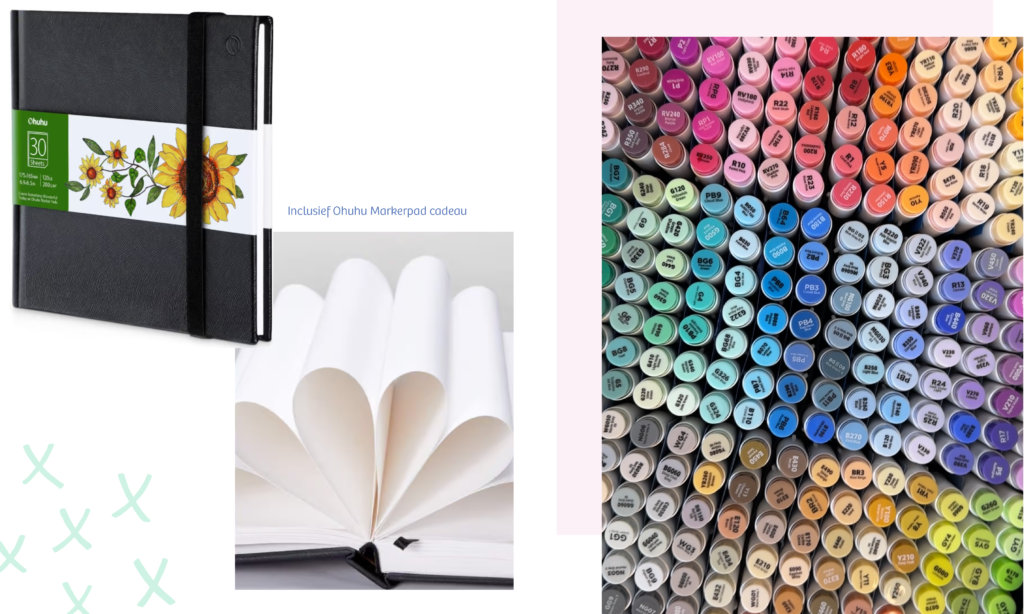Elke deelnemer krijgt een Ohuhu Markerpad brushpennen t.w.v. €12,95 cadeau van Be Creative Shop ✨ Ook krijg je na afloop een tijdelijke code van Be Creative, waarmee je na de workshop met 5% korting bij hen kan shoppen!